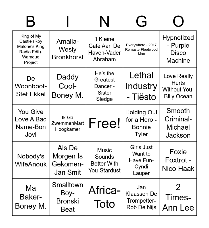 This bingo card has a free space and 46 words: (I've Had) The Time Of My Life - From "Dirty Dancing" SoundtrackBill Medley, 2 Times- Ann Lee, 9 to 5-Dolly Parton, Africa-Toto, Als De Morgen Is Gekomen-Jan Smit, Als De Zon Schijnt-André van Duin, Amalia-Wesly Bronkhorst, Angeleyes- ABBA, De Woonboot-Stef Ekkel, Ding-A-Dong -Teach In, Daddy Cool-Boney M., Everywhere - 2017 RemasterFleetwood Mac, Foxie Foxtrot -Nico Haak, Girls Just Want to Have Fun-Cyndi Lauper, Gotta Let You Go - Dominica, Happiness-Alexis Jordan, He's the Greatest Dancer - Sister Sledge, Holding Out for a Hero - Bonnie Tyler, Hotel California - 2013 RemasterEagles, Hypnotized - Purple Disco Machine, Ik Ga ZwemmenMart Hoogkamer, Jan Klaassen De Trompetter-Rob De Nijs, King of My Castle (Roy Malone's King Radio Edit)-Wamdue Project, Lethal Industry - Tiësto, Leef-André Hazes Jr., Love Really Hurts Without You-Billy Ocean, Ma Baker-Boney M., Met De Vlam In De Pijp-Henk Wijngaard, Music Sounds Better With You-Stardust, Nobody's WifeAnouk, Non non rien n'a changé-Les Poppy, Ons Moeder Zeej Nog-Jan Biggel, Papa-Stef Bos, Papa-Stef Bos, Rio - Maywood, Smalltown Boy-Bronski Beat, Smooth Criminal-Michael Jackson, Titanium (feat. Sia)-David Guetta, Uit M’n Bol-Andre Hazes, Wake Me Up Before You Go-Go-Wham!, 't Dondert En ’t Bliksemt-Guus Meeuwis, 't Kleine Café Aan De Haven-Vader Abraham, You Give Love A Bad Name-Bon Jovi, I Wanna Dance with Somebody (Who Loves Me)-Whitney Houston, Papa Loves Mambo-Perry Como and Material Girl-Madonna.