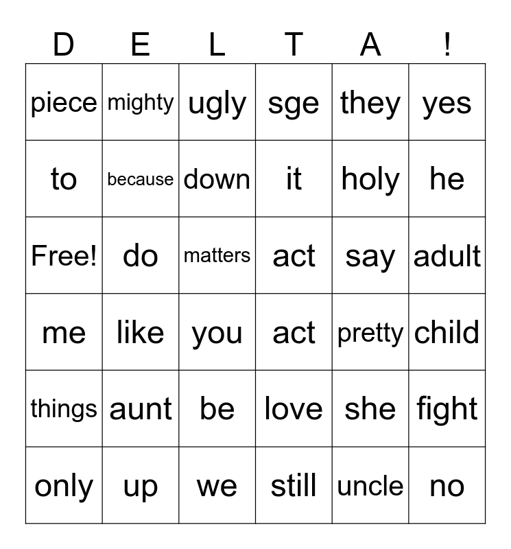 This bingo card has 36 words: love, be, still, to, me, act, because, we, they, she, he, sge, fight, do, it, piece, things, say, Free!, ugly, matters, like, act, you, pretty, mighty, holy, up, down, yes, no, only, child, adult, aunt and uncle.