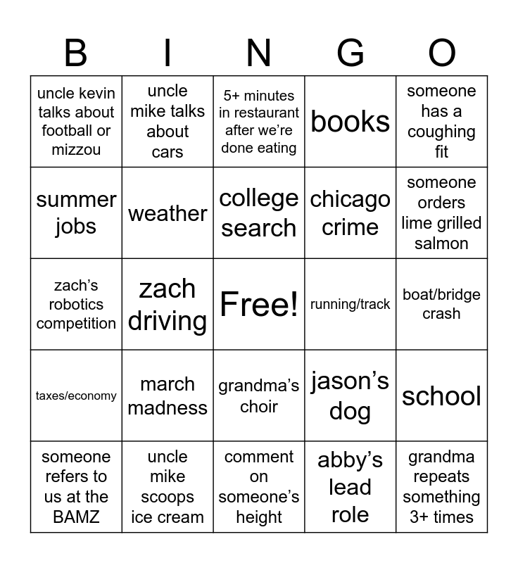 This bingo card has a free space and 24 words: march madness, uncle mike scoops ice cream, college search, someone refers to us at the BAMZ, someone has a coughing fit, uncle kevin talks about football or mizzou, summer jobs, uncle mike talks about cars, running/track, grandma’s choir, chicago crime, zach’s robotics competition, jason’s dog, school, weather, abby’s lead role, boat/bridge crash, 5+ minutes in restaurant after we’re done eating, someone orders lime grilled salmon, zach driving, grandma repeats something 3+ times, taxes/economy, books and comment on someone’s height.