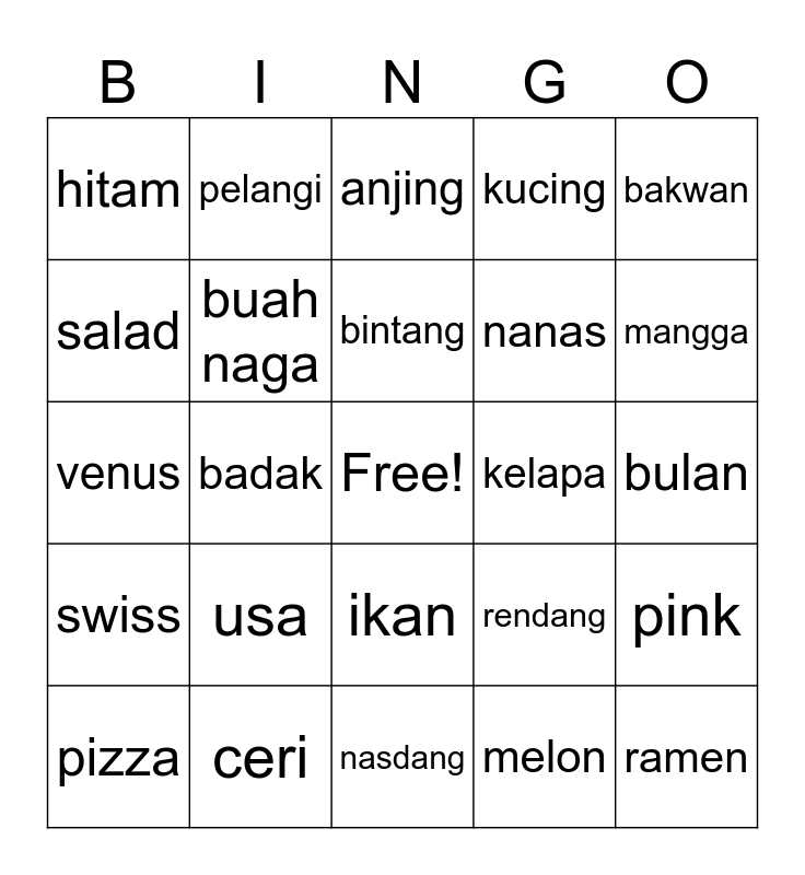 This bingo card has a free space and 24 words: usa, ceri, bintang, pizza, bakwan, hitam, salad, pelangi, kelapa, ikan, nanas, venus, rendang, pink, buah naga, melon, bulan, anjing, mangga, badak, ramen, swiss, kucing and nasdang.