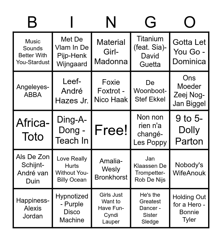 This bingo card has a free space and 47 words: 't Dondert En ’t Bliksemt-Guus Meeuwis, Holding Out for a Hero - Bonnie Tyler, Ma Baker-Boney M., Girls Just Want to Have Fun-Cyndi Lauper, Love Really Hurts Without You-Billy Ocean, Ik Ga Zwemmen-Mart Hoogkamer, Met De Vlam In De Pijp-Henk Wijngaard, Hotel California - Eagles, Angeleyes- ABBA, You Give Love A Bad Name-Bon Jovi, Leef-André Hazes Jr., Titanium (feat. Sia)-David Guetta, Nobody's WifeAnouk, Jan Klaassen De Trompetter-Rob De Nijs, Everywhere - 2017 RemasterFleetwood Mac, Papa-Stef Bos, Foxie Foxtrot -Nico Haak, Non non rien n'a changé-Les Poppy, Rio - Maywood, Gotta Let You Go - Dominica, Ding-A-Dong -Teach In, He's the Greatest Dancer - Sister Sledge, Music Sounds Better With You-Stardust, De Woonboot-Stef Ekkel, 2 Times- Ann Lee, Ons Moeder Zeej Nog-Jan Biggel, Happiness-Alexis Jordan, Uit M’n Bol-Andre Hazes, Amalia-Wesly Bronkhorst, Als De Zon Schijnt-André van Duin, Papa-Stef Bos, King of My Castle (Roy Malone's King Radio Edit)-Wamdue Project, Lethal Industry - Tiësto, (I've Had) The Time Of My Life - From "Dirty Dancing" SoundtrackBill Medley, 't Kleine Café Aan De Haven-Vader Abraham, Hypnotized - Purple Disco Machine, 9 to 5-Dolly Parton, Daddy Cool-Boney M., Als De Morgen Is Gekomen-Jan Smit, Smalltown Boy-Bronski Beat, Papa Loves Mambo-Perry Como, Material Girl-Madonna, Africa-Toto, Wake Me Up Before You Go-Go-Wham!, Smooth Criminal-Michael Jackson, I Wanna Dance with Somebody (Who Loves Me)-Whitney Houston and Engelbewaarder - Marco Schuitmaker.