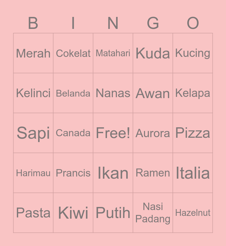 This bingo card has a free space and 24 words: Prancis, Kiwi, Nanas, Pasta, Kucing, Merah, Kelinci, Cokelat, Aurora, Ikan, Awan, Sapi, Ramen, Italia, Belanda, Nasi Padang, Pizza, Matahari, Kelapa, Canada, Hazelnut, Harimau, Kuda and Putih.