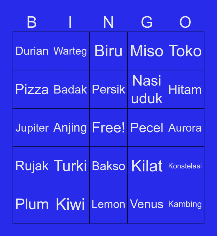 This bingo card has a free space and 24 words: Turki, Kiwi, Persik, Plum, Toko, Durian, Pizza, Warteg, Pecel, Bakso, Nasi uduk, Jupiter, Kilat, Konstelasi, Badak, Venus, Aurora, Biru, Hitam, Anjing, Kambing, Rujak, Miso and Lemon.