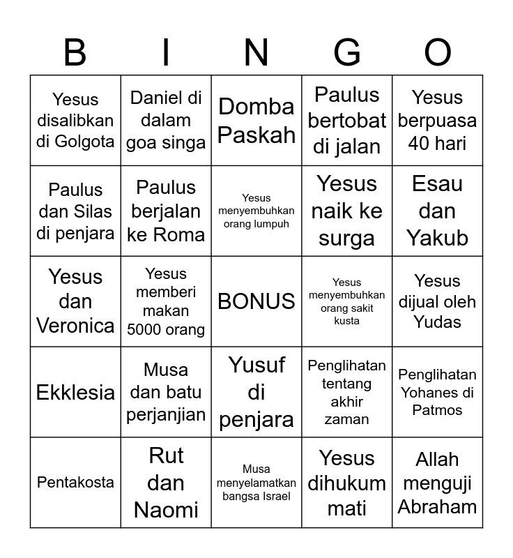 This bingo card has a free space and 50 words: Pelangi sehabis air bah, Allah menguji Abraham, Adam dan Hawa di Taman Eden, Musa menyelamatkan bangsa Israel, Musa dan batu perjanjian, Musa membelah laut merah, Daniel di dalam goa singa, Daniel di perapian, Paulus dan Silas di penjara, Paulus di hadapan raja Agripa, Paulus berjalan ke Roma, Paulus bertobat di jalan, Penglihatan Yohanes di Patmos, Penglihatan tentang akhir zaman, Yesus dibaptis oleh Yohanes, Yesus berjalan di atas air, Yesus menyembuhkan orang lumpuh, Yesus menyembuhkan orang sakit kusta, Yesus bangkit dari kematian, Yesus berpuasa 40 hari, Yesus memberi makan 5000 orang, Yesus dihukum mati, Yesus disalibkan di Golgota, Yesus naik ke surga, Yesus di Taman Getsemani, Bangsa Israel di padang gurun, Esau dan Yakub, Esau menjual kesulungannya, Domba Paskah, Yusuf di penjara, Yusuf dan potifar, Yusuf gagal di dalam penjara Mesir, Kehancuran Sodom dan Gomora, Samson dan rahasia rambutnya, Rut dan Naomi, Pembangunan dinding Yerusalem oleh Nehemia, Terbelahnya Laut Merah, Kain membunuh Habel, Jalan Salib, Yesus dijual oleh Yudas, Yesus menampakkan diri kepada Tomas, Doa di Taman Getsemani, Perjamuan Terakhir, Journey of Hope, Pentakosta, Yesus dan Veronica, Yesus membasuh kaki murid-muridNya, INRI, Ekklesia and Selamat Paskah!.