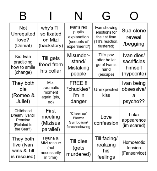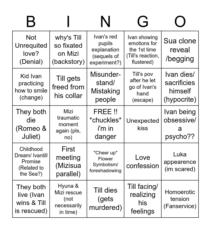 This bingo card has a free space and 24 words: First meeting (Mizisua parallel), Hyuna & Mizi rescue (not necessarily in time), Misunder-stand/ Mistaking people, They both live (Ivan wins & Till is rescued), Sua clone reveal /begging, Not Unrequited love? (Denial), Kid Ivan practicing how to smile (change), why's Till so fixated on Mizi (backstory), Unexpected kiss, "Cheer up" Flower Symbolism/ foreshadowing, Till's pov after he let go of Ivan's hand (escape), They both die (Romeo & Juliet), Love confession, Luka appearence (im scared), Till gets freed from his collar, Till facing/ realizing his feelings, Ivan being obsessive/ a psycho??, Ivan's red pupils explanation (sequels of experiment?), Ivan dies/ sacrificies himself (hypocrite), Mizi traumatic moment again (pls, no), Homoerotic tension (Fanservice), Childhood Dream/ Ivantill Promise (Related to the Sea?), Ivan showing emotions for the 1st time (Till's reaction, flustered) and Till dies (gets murdered).