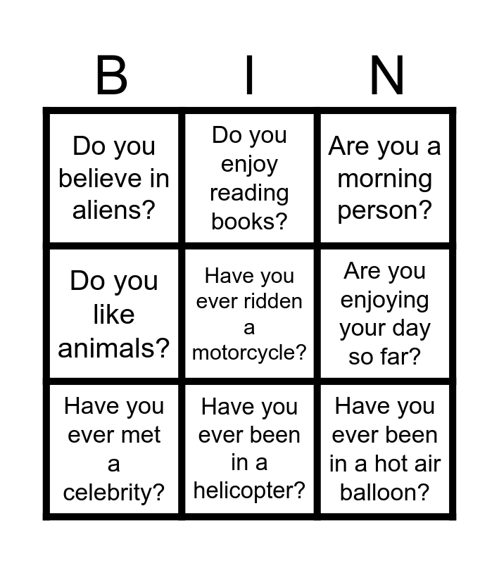 This bingo card has a free space and 8 words: Are you enjoying your day so far?, Are you a morning person?, Do you enjoy reading books?, Have you ever met a celebrity?, Do you believe in aliens?, Have you ever been in a hot air balloon?, Do you like animals? and Have you ever been in a helicopter?.