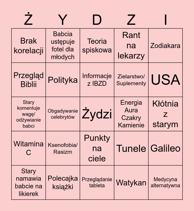 This bingo card has a free space and 24 words: Ksenofobia/ Rasizm, Polecajka książki, Informacje z IBZD, Stary namawia babcie na likierek, Zodiakara, Brak korelacji, Przegląd Biblii, Babcia ustępuje fotel dla młodych, Energia Aura Czakry Kamienie, Punkty na ciele, Zielarstwo/ Suplementy, Stary komentuje wagę/ odżywianie babci, Tunele, Galileo, Polityka, Watykan, Kłótnia z starym, Teoria spiskowa, USA, Obgadywanie celebrytów, Medycyna alternatywna, Witamina C, Rant na lekarzy and Przeglądanie tableta.