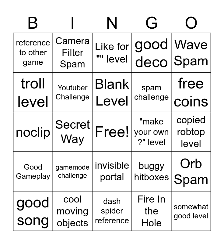 This bingo card has a free space and 32 words: Fire In the Hole, Impossible Level, Secret Way, Object Barf, Good Gameplay, Youtuber Challenge, Wave Spam, Orb Spam, Camera Filter Spam, Skip, Blank Level, Like for "" level, hold from start level, auto level with obstacles, "make your own ?" level, bloodbath reference, good song, noclip, invisible portal, gamemode challenge, buggy hitboxes, bug, copied robtop level, cool moving objects, somewhat good level, good deco, spam challenge, troll level, reference to other game, dash spider reference, congregation jumpscare and free coins.