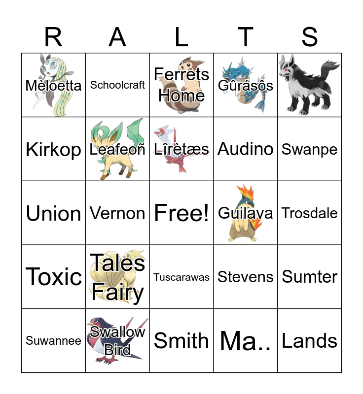 This bingo card has 24 images and 81 words: Miasa, Showers, Ferrets Home, Sa-naito, Çōsîmœg, Ayûarîtà, Swallow Bird, Chick, ẞerisa, ÀdèæÆb, Toîàræmœñ, ẞepits, Free!, Guilava, Àûksëñ, Mèloetta, Tales Fairy, Lîrètæs, Dragon, Mentamon, Sèwal, Leafeoñ, Sûdàlñè, Gûrásôs, Pokemon, Scatterfuzz, Lake Superior, Florence, Vivinymph, Toxic, Pratt, Smith, Stevens, Sumter, Suwannee, Peru, Puno, Audino, Lands, Shaiwansee, Schoolcraft, Iosco, Ioina, Iron, Kirkop, Usawa, Tuscarawas, Summit, Stark, Vermillon, Vernon, Marion, Morgan, Morton, Kukanee, Lyon, Jones, Trosdale., Trosdale, Moltrie, Mulneburg, Union, Lownders, Shelby, Gallade, Ralts, Kirlia, Froslass, Change, Dragon, Power, Swanpe, Banette, Slow, Ma., Ma.., Mai, Kirlias., Page, Angel - gallade and Munna.