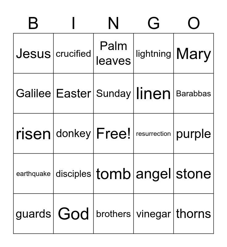 This bingo card has a free space and 24 words: disciples, God, Sunday, guards, Mary, Jesus, Galilee, crucified, resurrection, tomb, linen, risen, angel, stone, Easter, vinegar, purple, Palm leaves, Barabbas, donkey, thorns, earthquake, lightning and brothers.