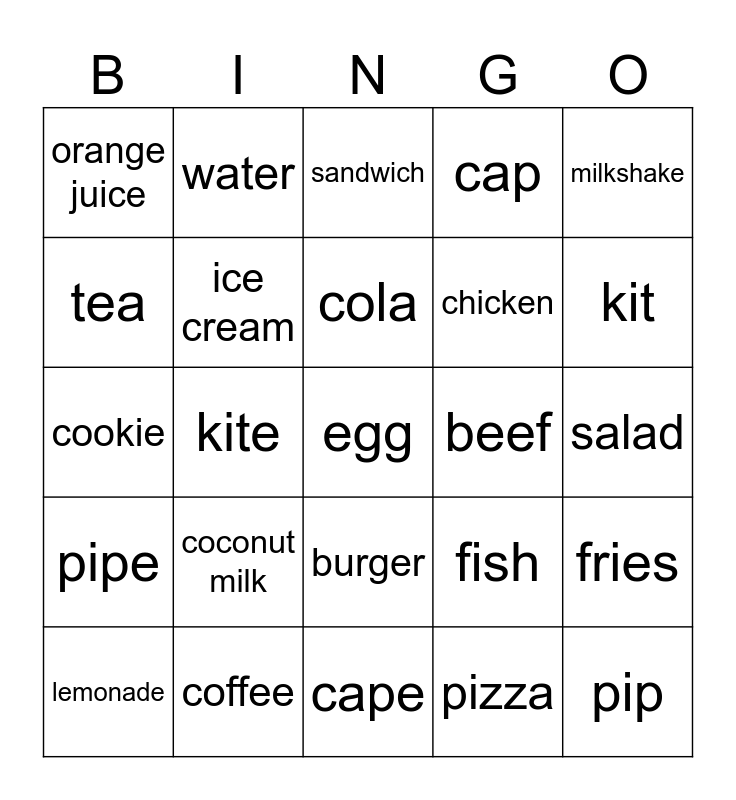 This bingo card has a free space and 24 words: coconut milk, coffee, cola, lemonade, milkshake, orange juice, tea, water, beef, burger, chicken, cookie, fish, fries, ice cream, pizza, salad, sandwich, kit, kite, pip, pipe, cap and cape.