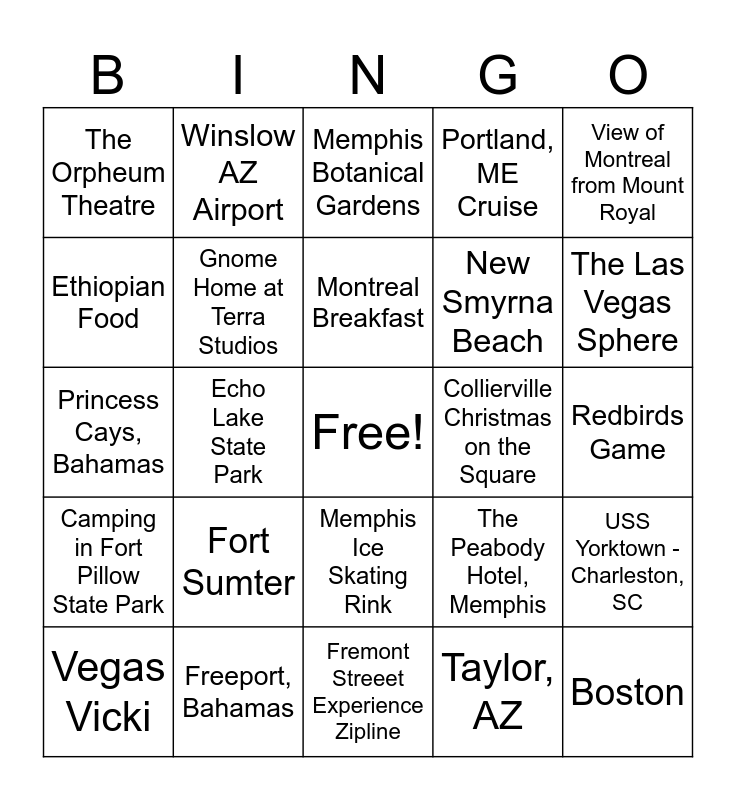 This bingo card has a free space and 37 words: Overton Park Concert, Florida Air Boat Ride, Kennedy Space Center, Gnome Home at Terra Studios, USS Yorktown - Charleston, SC, Fort Sumter, Montreal Breakfast, Saint Joseph's Oratory - Montreal, View of Montreal from Mount Royal, Basilique Notre Dame De Montreal, Echo Lake State Park, Portland, ME Cruise, Boston, Redbirds Game, Ethiopian Food, Camping in Fort Pillow State Park, Candle Light Concert - Memphis, Memphis Botanical Gardens, Memphis Ice Skating Rink, Collierville Christmas on the Square, The Orpheum Theatre, The Las Vegas Sphere, Vegas Vicki, Fremont Streeet Experience Zipline, The High Roller, Taylor, AZ, Winslow AZ Airport, La Posada Restaurant and Train Station, Cincinnati OH, Collierville Boardwalk, Jetti Park - Port Canaveral, Freeport, Bahamas, Princess Cays, Bahamas, Bingo at Isaac's Apartment, The Peabody Hotel, Memphis, New Smyrna Beach and Running of the Weenies.