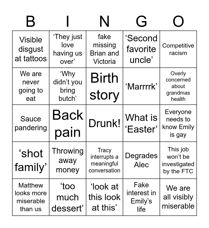 This bingo card has a free space and 24 words: Throwing away money, ‘too much dessert’, Birth story, Matthew looks more miserable than us, Competitive racism, Visible disgust at tattoos, We are never going to eat, ‘They just love having us over’, What is ‘Easter’, Tracy interrupts a meaningful conversation, ‘Marrrrk’, Sauce pandering, Degrades Alec, This job won’t be investigated by the FTC, ‘Why didn’t you bring butch’, Fake interest in Emily’s life, Everyone needs to know Emily is gay, fake missing Brian and Victoria, Overly concerned about grandmas health, Back pain, We are all visibly miserable, ‘shot family’, ‘Second favorite uncle’ and ‘look at this look at this’.