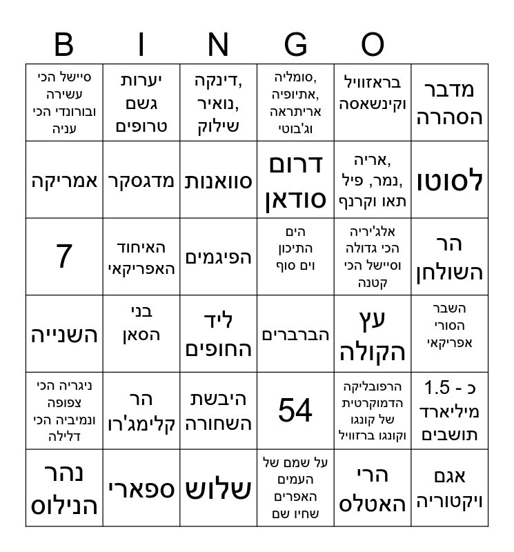 This bingo card has 36 words: 54, היבשת השחורה, על שמם של העמים האפרים שחיו שם, אמריקה, השנייה, הים התיכון וים סוף, מדגסקר, שלוש, בראזוויל וקינשאסה, הרפובליקה הדמוקרטית של קונגו וקונגו ברזוויל, לסוטו, סומליה, אתיופיה, אריתראה וג'בוטי, כ - 1.5 מיליארד תושבים, האיחוד האפריקאי, דרום סודאן, סיישל הכי עשירה ובורונדי הכי עניה, ניגריה הכי צפופה ונמיביה הכי דלילה, אלג'יריה הכי גדולה וסיישל הכי קטנה, 7, דינקה, נואיר, שילוק, הפיגמים, בני הסאן, הברברים, ליד החופים, עץ הקולה, יערות גשם טרופים, אריה, נמר, פיל, תאו וקרנף, ספארי, סוואנות, מדבר הסהרה, אגם ויקטוריה, נהר הנילוס, השבר הסורי אפריקאי, הר השולחן, הר קלימג'רו and הרי האטלס.