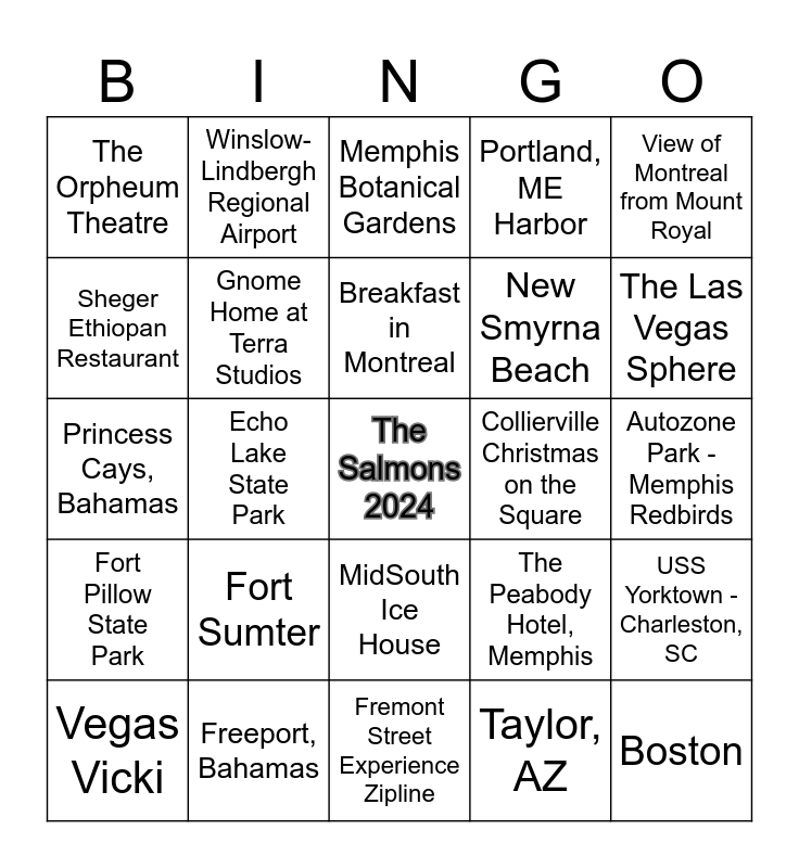 This bingo card has a free space and 37 words: Overton Park Concert, Florida Air Boat Ride, Kennedy Space Center, Gnome Home at Terra Studios, USS Yorktown - Charleston, SC, Fort Sumter, Breakfast in Montreal, Saint Joseph's Oratory - Montreal, View of Montreal from Mount Royal, Basilique Notre Dame De Montreal, Echo Lake State Park, Portland, ME Harbor, Boston, Autozone Park - Memphis Redbirds, Sheger Ethiopan Restaurant, Fort Pillow State Park, Candle Light Concert - Memphis, Memphis Botanical Gardens, MidSouth Ice House, Collierville Christmas on the Square, The Orpheum Theatre, The Las Vegas Sphere, Vegas Vicki, Fremont Street Experience Zipline, The High Roller, Taylor, AZ, Winslow-Lindbergh Regional Airport, La Posada Restaurant and Train Station, Cincinnati, OH, Collierville Boardwalk, Jetti Park - Port Canaveral, Freeport, Bahamas, Princess Cays, Bahamas, Bingo at Isaac's Apartment, The Peabody Hotel, Memphis, New Smyrna Beach and Germantown Running of the Weenies.
