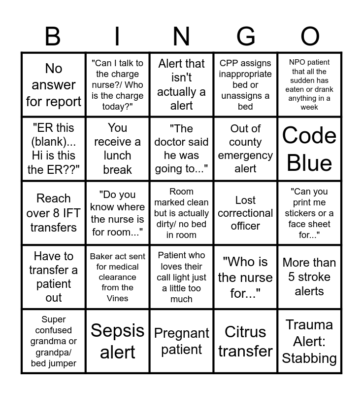 This bingo card has 35 words: "No report?!", Paije = Mig?, Lab recollect or critical, You receive a lunch break, Patient who loves their call light just a little too much, CPP assigns inappropriate bed or unassigns a bed, "ER this (blank)... Hi is this the ER??", "When will I get a room?", "The doctor said he was going to...", Needs ultrasound IV, Reach over 8 IFT transfers, NPO patient that all the sudden has eaten or drank anything in a week, Free!, "My mom has been waiting for pain meds for 5 minutes!!!", No answer for report, Lost correctional officer, Citrus transfer, "Do you know where the nurse is for room...", Have to transfer a patient out, Room marked clean but is actually dirty/ no bed in room, "Who is the nurse for...", Super confused grandma or grandpa/ bed jumper, More than 5 stroke alerts, Sepsis alert, Alert that isn't actually a alert, Code Blue, Trauma Alert: Stabbing, Trauma Alert: Shooting, Out of county emergency alert, "Can you print me stickers or a face sheet for...", Stemi alert, Pregnant patient, Baker act sent for medical clearance from the Vines, "Can I talk to the charge nurse?/ Who is the charge today?" and OPD assistance needed.