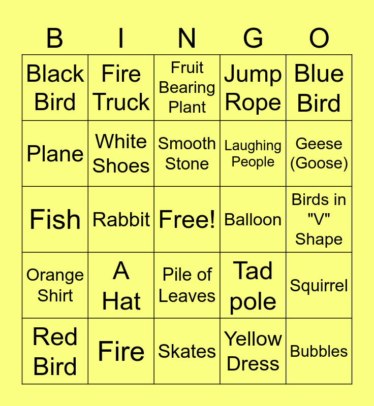 This bingo card has a free space and 24 words: A Hat, Fire, Smooth Stone, Red Bird, Blue Bird, Black Bird, Plane, Fire Truck, Balloon, Pile of Leaves, Laughing People, Fish, Tad pole, Squirrel, White Shoes, Yellow Dress, Birds in "V" Shape, Fruit Bearing Plant, Geese (Goose), Rabbit, Bubbles, Orange Shirt, Jump Rope and Skates.