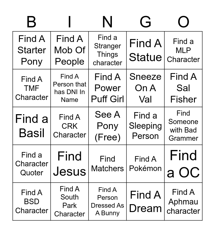 This bingo card has a free space and 24 words: Find Jesus, Find A South Park Character, Find A Power Puff Girl, Find A BSD Character, Find a MLP Character, Find A Starter Pony, Find A TMF Character, Find A Mob Of People, Find a Sleeping Person, Find Matchers, Sneeze On A Val, Find a Basil, Find A Pokémon, Find a OC, Find A Person that has DNI In Name, Find A Dream, Find Someone with Bad Grammer, Find a Stranger Things character, Find A Sal Fisher, Find A CRK Character, Find A Aphmau character, Find a Character Quoter, Find A Statue and Find A Person Dressed As A Bunny.