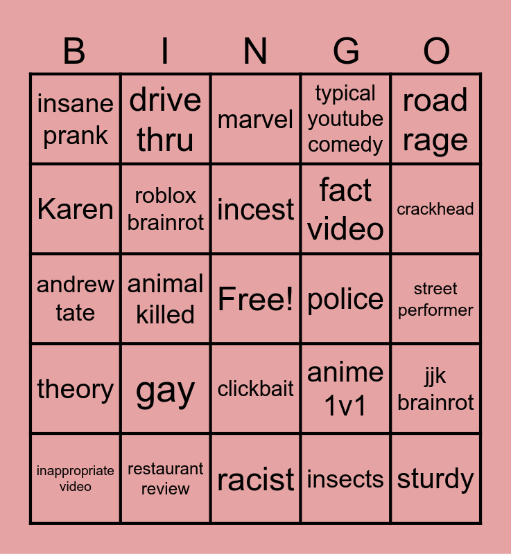 This bingo card has a free space and 25 words: gay, racist, incest, inappropriate video, road rage, insane prank, Karen, drive thru, police, clickbait, fact video, andrew tate, anime 1v1, jjk brainrot, roblox brainrot, skibidi, street performer, marvel, crackhead, animal killed, sturdy, restaurant review, theory, typical youtube comedy and insects.