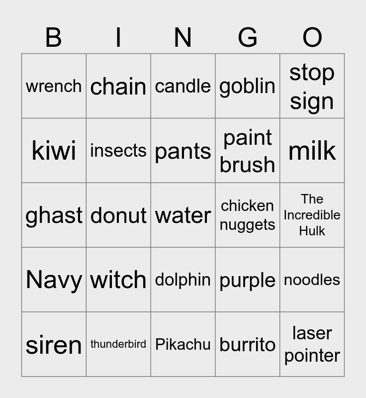 This bingo card has a free space and 24 words: witch, thunderbird, pants, siren, stop sign, wrench, kiwi, chain, chicken nuggets, dolphin, paint brush, ghast, purple, noodles, insects, burrito, The Incredible Hulk, candle, milk, donut, laser pointer, Navy, goblin and Pikachu.