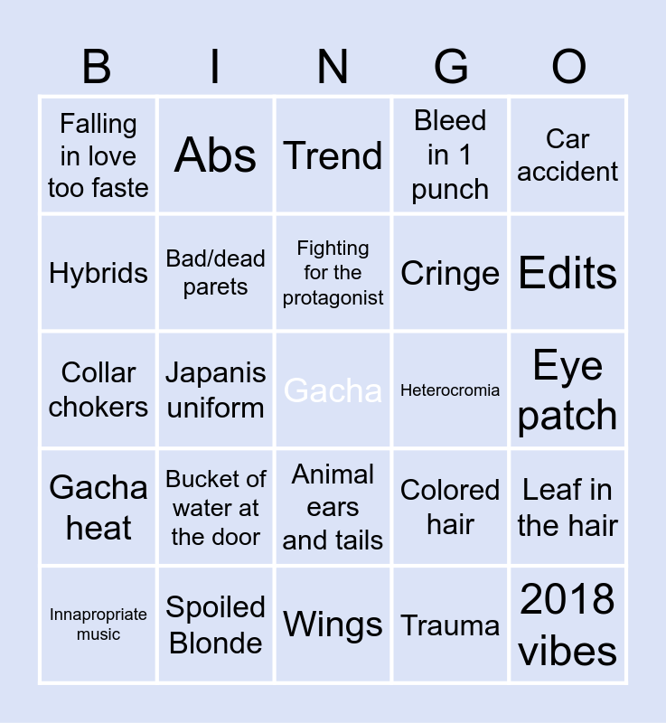 This bingo card has a free space and 60 words: Kinnermastrer, Spoiled Blonde, Crush in the bad boy, Gacha heat, Trauma, Yuri/Yaoi, Bad/dead parets, Love triangle, Cringe, Scars, Bleed in 1 punch, Smoke the lollipops, Hybrids, Femboys, Fake friends, Falling in love too faste, 2018 vibes, Car accident, Betrayal, Fighting for the protagonist, Heterocromia, Trend, Innapropriate music, Leaf in the hair, Stutter, Killer, Bad twin, Perverts, Edits, Toxic character, Music box, Big intro, Slow walk, Tomboy, Abs, Tongue kiss, Explicit thumbnail, Japanis uniform, Knives (Not for cooking), Collar chokers, Bully, Bucket of water at the door, Eye patch, Minors whit weapons, Colored hair, Blind in one eye, Suspicious relationships, "In love with my...", Maid costume, Animal ears and tails, Wings, Horns, Teleportation powers, Powers, Crimes, Heat moments, Inappropriat clothig at school, Blood, Kicks and Good mom, bad dad.