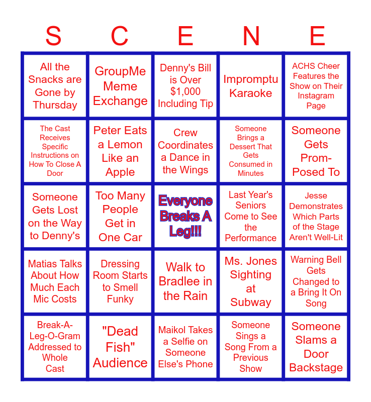 This bingo card has a free space and 24 words: Break-A-Leg-O-Gram Addressed to Whole Cast, Dressing Room Starts to Smell Funky, Crew Coordinates a Dance in the Wings, Someone Sings a Song From a Previous Show, ACHS Cheer Features the Show on Their Instagram Page, All the Snacks are Gone by Thursday, GroupMe Meme Exchange, Denny's Bill is Over $1,000 Including Tip, Last Year's Seniors Come to See the Performance, Jesse Demonstrates Which Parts of the Stage Aren't Well-Lit, Someone Gets Lost on the Way to Denny's, Peter Eats a Lemon Like an Apple, Ms. Jones Sighting at Subway, Warning Bell Gets Changed to a Bring It On Song, The Cast Receives Specific Instructions on How To Close A Door, "Dead Fish" Audience, Maikol Takes a Selfie on Someone Else's Phone, Impromptu Karaoke, Someone Gets Prom-Posed To, Matias Talks About How Much Each Mic Costs, Too Many People Get in One Car, Walk to Bradlee in the Rain, Someone Brings a Dessert That Gets Consumed in Minutes and Someone Slams a Door Backstage.
