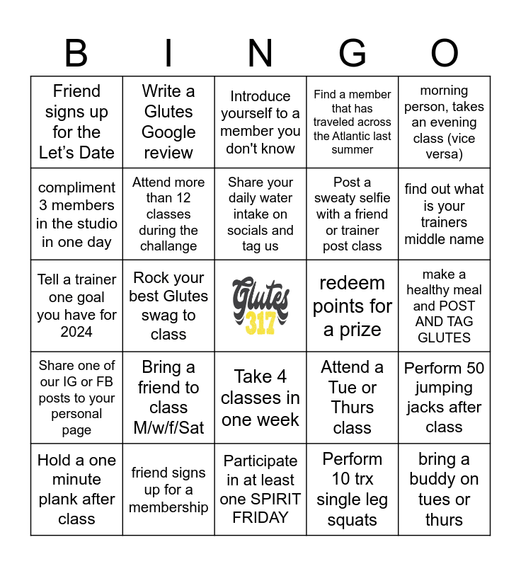 This bingo card has a free space and 24 words: Bring a friend to class M/w/f/Sat, friend signs up for a membership, Share your daily water intake on socials and tag us, Hold a one minute plank after class, morning person, takes an evening class (vice versa), Friend signs up for the Let’s Date, compliment 3 members in the studio in one day, Write a Glutes Google review, redeem points for a prize, Take 4 classes in one week, Post a sweaty selfie with a friend or trainer post class, Tell a trainer one goal you have for 2024, Attend a Tue or Thurs class, Perform 50 jumping jacks after class, Attend more than 12 classes during the challange, Perform 10 trx single leg squats, make a healthy meal and POST AND TAG GLUTES, Introduce yourself to a member you don't know, find out what is your trainers middle name, Rock your best Glutes swag to class, bring a buddy on tues or thurs, Share one of our IG or FB posts to your personal page, Find a member that has traveled across the Atlantic last summer and Participate in at least one SPIRIT FRIDAY.