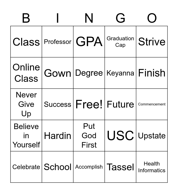 This bingo card has a free space and 24 words: Hardin, School, Degree, Celebrate, Strive, Class, Online Class, Professor, Future, Put God First, Keyanna, Never Give Up, USC, Upstate, Gown, Tassel, Commencement, GPA, Finish, Success, Health Informatics, Believe in Yourself, Graduation Cap and Accomplish.