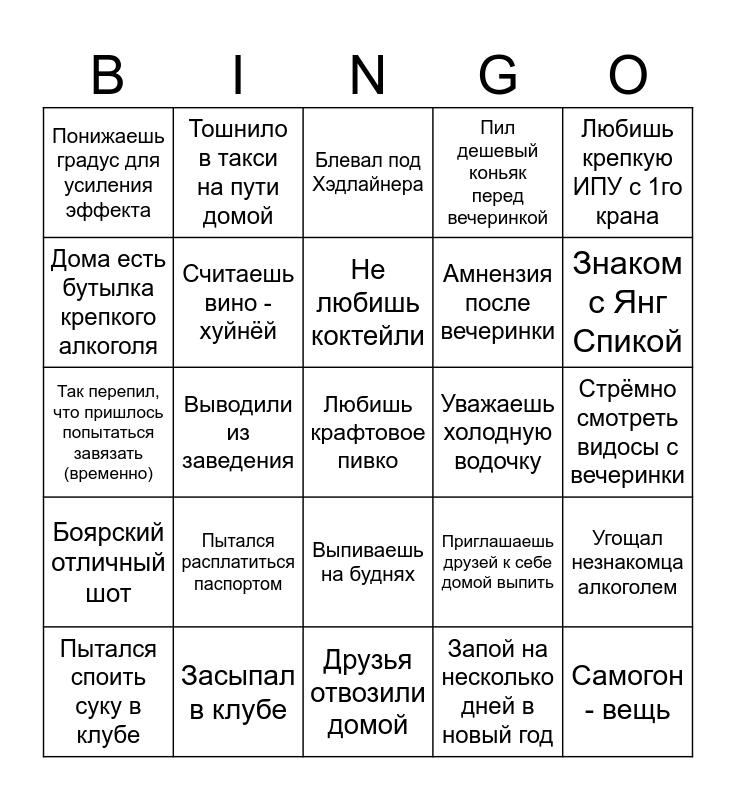 This bingo card has a free space and 24 words: Пытался расплатиться паспортом, Засыпал в клубе, Не любишь коктейли, Пытался споить суку в клубе, Любишь крепкую ИПУ с 1го крана, Понижаешь градус для усиления эффекта, Дома есть бутылка крепкого алкоголя, Тошнило в такси на пути домой, Уважаешь холодную водочку, Выпиваешь на буднях, Амнензия после вечеринки, Так перепил, что пришлось попытаться завязать (временно), Приглашаешь друзей к себе домой выпить, Угощал незнакомца алкоголем, Считаешь вино - хуйнёй, Запой на несколько дней в новый год, Стрёмно смотреть видосы с вечеринки, Блевал под Хэдлайнера, Знаком с Янг Спикой, Выводили из заведения, Самогон - вещь, Боярский отличный шот, Пил дешевый коньяк перед вечеринкой and Друзья отвозили домой.