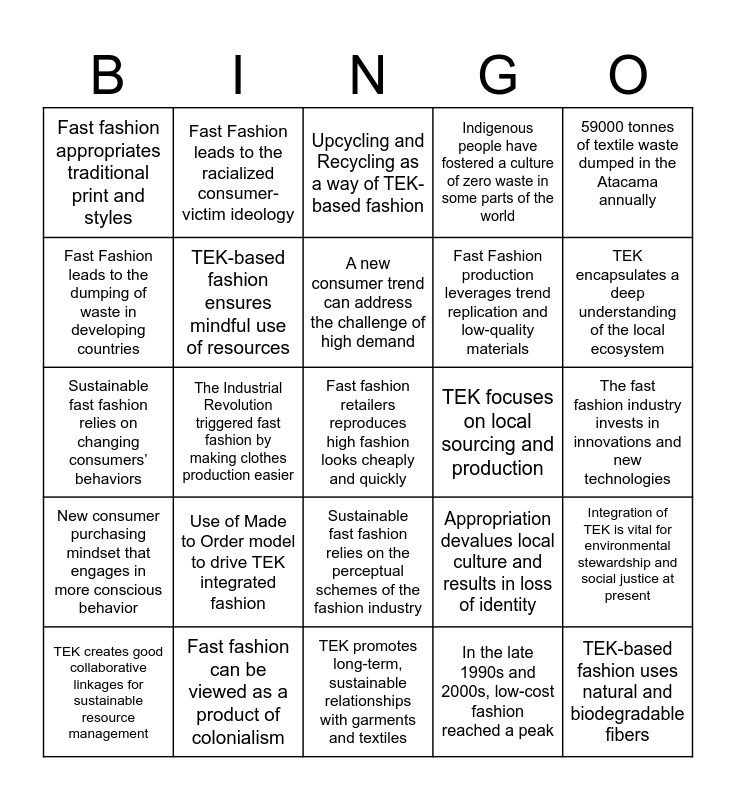 This bingo card has a free space and 24 words: Use of Made to Order model to drive TEK integrated fashion, Fast fashion can be viewed as a product of colonialism, A new consumer trend can address the challenge of high demand, TEK creates good collaborative linkages for sustainable resource management, 59000 tonnes of textile waste dumped in the Atacama annually, Fast fashion appropriates traditional print and styles, Fast Fashion leads to the dumping of waste in developing countries, Fast Fashion leads to the racialized consumer-victim ideology, TEK focuses on local sourcing and production, Sustainable fast fashion relies on the perceptual schemes of the fashion industry, Fast Fashion production leverages trend replication and low-quality materials, Sustainable fast fashion relies on changing consumers’ behaviors, Appropriation devalues local culture and results in loss of identity, Integration of TEK is vital for environmental stewardship and social justice at present, TEK-based fashion ensures mindful use of resources, In the late 1990s and 2000s, low-cost fashion reached a peak, The fast fashion industry invests in innovations and new technologies, Upcycling and Recycling as a way of TEK-based fashion, TEK encapsulates a deep understanding of the local ecosystem, The Industrial Revolution triggered fast fashion by making clothes production easier, TEK-based fashion uses natural and biodegradable fibers, New consumer purchasing mindset that engages in more conscious behavior, Indigenous people have fostered a culture of zero waste in some parts of the world and TEK promotes long-term, sustainable relationships with garments and textiles.