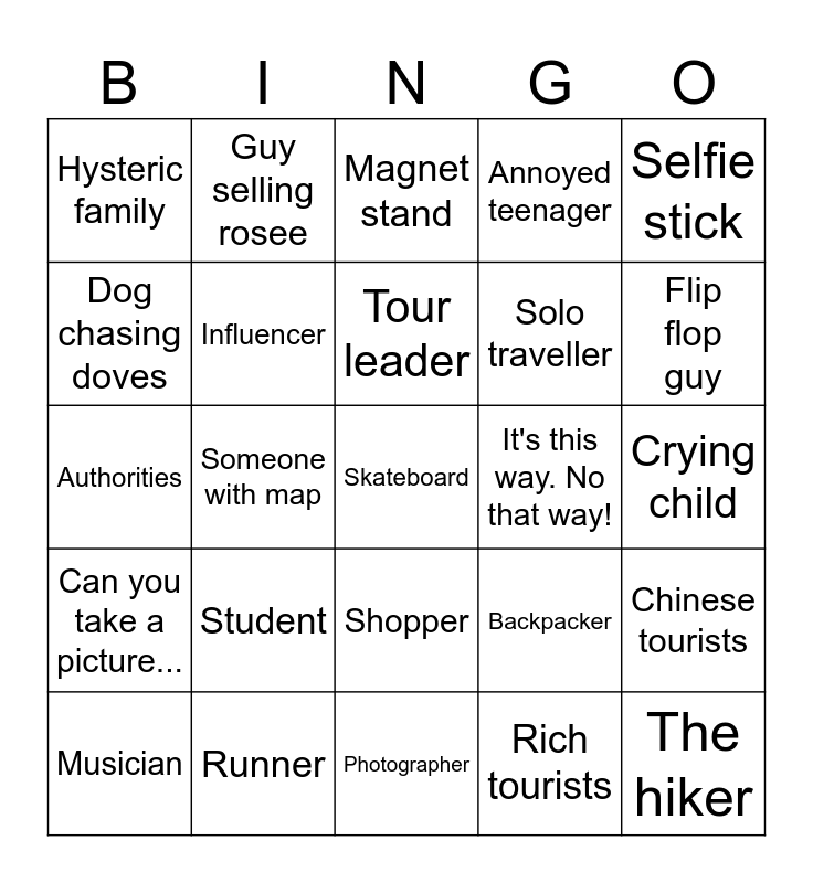 This bingo card has a free space and 24 words: Student, Runner, Tour leader, Musician, Selfie stick, Hysteric family, Dog chasing doves, Guy selling rosee, It's this way. No that way!, Shopper, Solo traveller, Authorities, Backpacker, Chinese tourists, Influencer, Rich tourists, Crying child, Magnet stand, Flip flop guy, Someone with map, The hiker, Can you take a picture..., Annoyed teenager and Photographer.