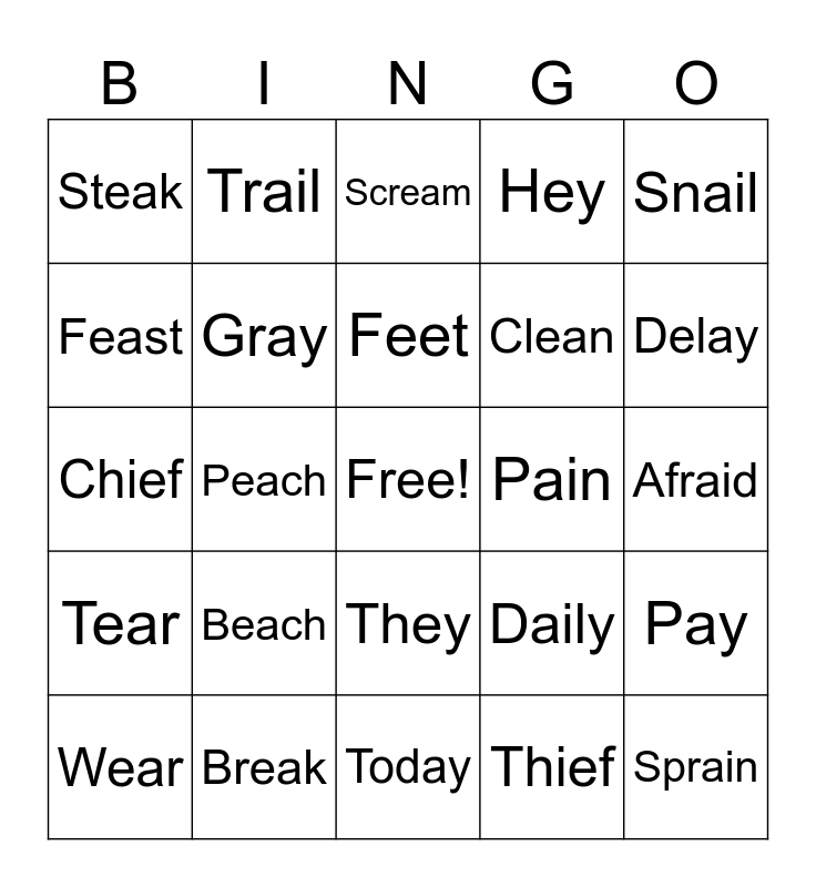 This bingo card has a free space and 24 words: Beach, Break, Feet, Wear, Snail, Steak, Feast, Trail, Pain, They, Clean, Chief, Daily, Pay, Gray, Thief, Afraid, Scream, Delay, Peach, Sprain, Tear, Hey and Today.