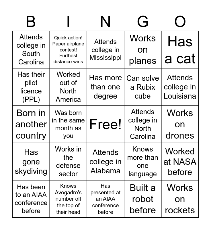 This bingo card has a free space and 37 words: Attends college in Florida, Attends college in Georgia, Attends college in Tennessee, Worked out of North America, Worked at NASA before, Works in the defense sector, Has more than one degree, Has a dog, Has a cat, Broken 10 bones, Was born in the same month as you, Works on planes, Works on rockets, Works on drones, Has their pilot licence (PPL), Has gone skydiving, Can recite the first 10 digits of pi, Attends college in Mississippi, Attends college in Alabama, Attends college in North Carolina, Attends college in South Carolina, Attends college in Louisiana, Has been to an AIAA conference before, Has presented at an AIAA conference before, Has seen a rocket launch before, Built a robot before, Quick action! Paper airplane contest! Furthest distance wins, Quick action! Dance contest! The best “robot” move wins, Find someone who can do the “moonwalk”, Has gone scuba diving, Has driven a racecar before, Knows Avogadro's number off the top of their head, Born in another country, Attended university in another country, Knows more than one language, Can solve a Rubix cube and Can say the ABCs backwards.