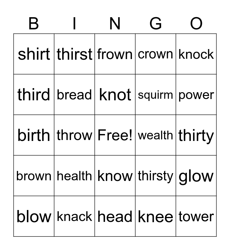 This bingo card has a free space and 26 words: know, knee, knot, knack, knock, shirt, third, thirst, thirty, thirsty, squirm, birth, glow, blow, throw, plow, crown, brown, frown, tower, power, head, wealth, health, bread and thread.