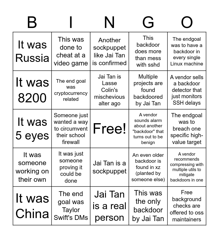 This bingo card has a free space and 24 words: It was China, It was just someone proving it could be done, Jai Tan is Lasse Colin's mischevious alter ago, This was the only backdoor by Jai Tan, The endgoal was to have a backdoor in every single Linux machine, It was Russia, This was done to cheat at a video game, Another sockpuppet like Jai Tan is confirmed, A vendor sounds alarm about another "backdoor" that turns out to be benign, The endgoal was to breach one specific high-value target, It was 5 eyes, The end goal was cryptocurrency related, An even older backdoor is found in xz (planted by someone else), A vendor recommends compressing with multiple utils to mitigate backdoors in one, It was 8200, The end goal was Taylor Swift's DMs, Jai Tan is a real person, This backdoor does more than mess with sshd, A vendor sells a backdoor detector that just monitors SSH delays, It was someone working on their own, Someone just wanted a way to circumvent their school firewall, Jai Tan is a sockpuppet, Multiple projects are found backdoored by Jai Tan and Free background checks are offered to oss maintainers.