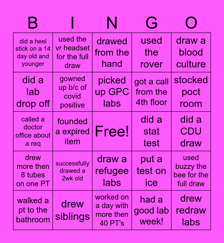 This bingo card has a free space and 25 words: successfully drawed a 2wk old, worked on a day with more then 40 PT's, picked up GPC labs, walked a pt to the bathroom, draw a blood culture, did a heel stick on a 14 day old and younger, did a lab drop off, used the vr headset for the full draw, did a stat test, draw a refugee labs, got a call from the 4th floor, called a doctor office about a req, put a test on ice, used buzzy the bee for the full draw, gowned up b/c of covid positive, didn't miss a stick for a full day, did a CDU draw, drawed from the hand, stocked poct room, founded a expired item, drew redraw labs, drew siblings, drew more then 8 tubes on one PT, used the rover and had a good lab week!.