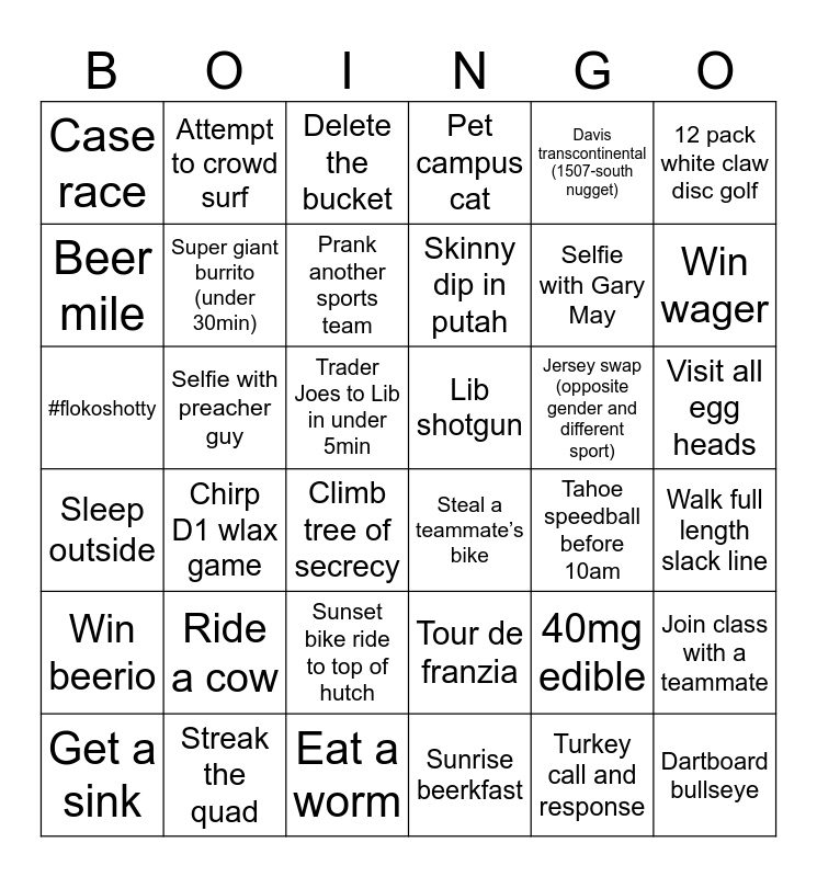 This bingo card has 40 words: Eat a worm, Selfie with Gary May, Sunrise on picnic day, Beer mile, Steal a teammate’s bike, Visit all egg heads, Super giant burrito (under 30min), Hit the wall, Davis transcontinental (1507-south nugget), Lib shotgun, Win wager, Pet campus cat, #flokoshotty, Trader Joes to Lib in under 5min, Selfie with preacher guy, Jersey swap (opposite gender and different sport), Join class with a teammate, Case race, Sunrise beerkfast, Delete the bucket, Chirp D1 wlax game, Walk full length slack line, Prank another sports team, 12 pack white claw disc golf, Turkey call and response, Tour de franzia, Ride a cow, Dartboard bullseye, Win beerio, Sunset bike ride to top of hutch, Great American Challenge, Climb tree of secrecy, Get a sink, Sleep outside, Skinny dip in putah, Tahoe speedball before 10am, 40mg edible, Streak the quad, Attempt to crowd surf and 24hr in 24hr room.