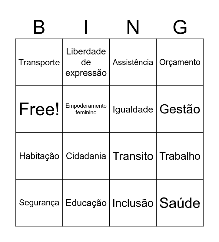 This bingo card has 16 words: Educação, Trabalho, Assistência, Transporte, Habitação, Liberdade de expressão, Transito, Inclusão, Free!, Empoderamento feminino, Segurança, Orçamento, Cidadania, Gestão, Igualdade and Saúde.