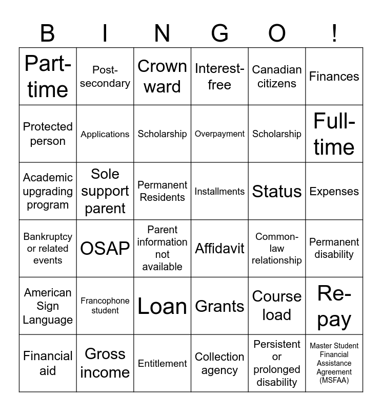 This bingo card has 64 words: Free!, Grants, Loans, OSAP, Financial aid, Costs, Post-secondary, SIN, Applications, Tuition, Expenses, Ontario resident, Permanent Residents, Canadian citizens, Deadline, Finances, Full-time, Part-time, Bursary, Scholarship, Status, Installments, Interest-free, Re-pay, Default, Collection agency, Gross income, Independent student, Loan, Master Student Financial Assistance Agreement (MSFAA), National Student Loans Service Centre (NSLSC), Official sponsor, Ontario Education Number (OEN), OSAP, Overpayment, Parent information not available, Part-time studies, Permanent disability, Persistent or prolonged disability, Protected person, Scholarship, Sole support parent, Study period, Academic progress, Academic year, Academic upgrading program, Affidavit, American Sign Language, Bankruptcy or related events, Bursary, Child in extended society care, Compulsory fees, Common-law relationship, Course load, Consumer proposal, Credit check, Crown ward, Dependent student, Entitlement, Expected financial contributions, Family breakdown, Financial need, Francophone student and Full-time studies.