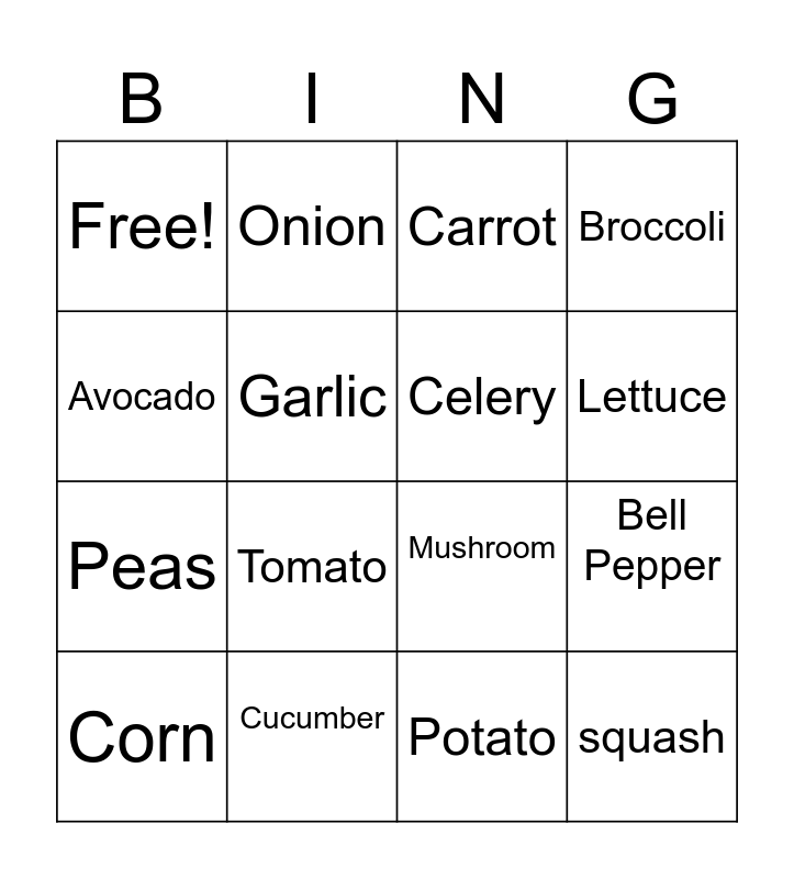 This bingo card has 16 words: Corn, Cucumber, Carrot, Broccoli, Avocado, Onion, Mushroom, Bell Pepper, Free!, Garlic, Potato, Lettuce, Peas, Tomato, Celery and squash.