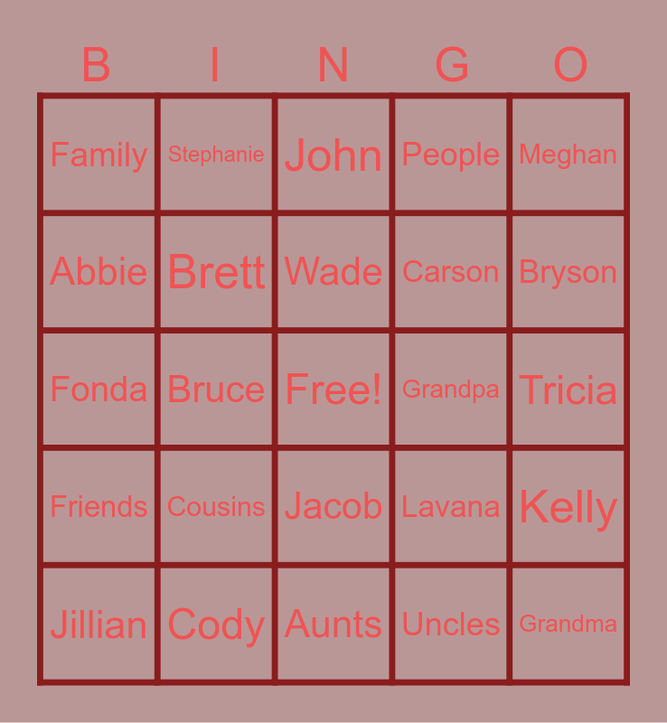 This bingo card has a free space and 24 words: Jillian, Cousins, Wade, Uncles, Meghan, Family, Stephanie, John, Grandpa, Tricia, Fonda, Brett, Lavana, Kelly, Abbie, Cody, Aunts, People, Bryson, Friends, Bruce, Jacob, Carson and Grandma.