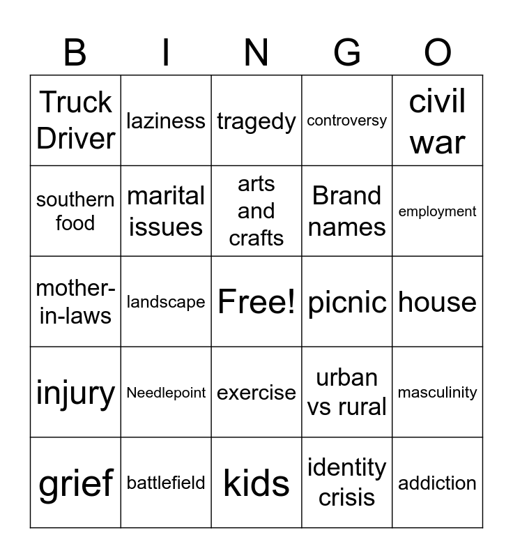 This bingo card has a free space and 24 words: Needlepoint, battlefield, arts and crafts, grief, civil war, Truck Driver, southern food, laziness, picnic, exercise, Brand names, mother-in-laws, urban vs rural, masculinity, marital issues, identity crisis, house, tragedy, employment, landscape, addiction, injury, controversy and kids.