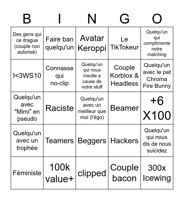 This bingo card has a free space and 24 words: Teamers, 100k value+, Quelqu'un qui nous insulte a cause de notre stuff, Féministe, Quelqu'un qui complimente notre matching, Des gens qui ce drague (couple non autorisé), I<3WS10, Faire ban quelqu'un, Beamer, Beggers, Couple Korblox & Headless, Quelqu'un avec "Mimi" en pseudo, Hackers, Quelqu'un qui nous dis de nous suicidez, Connasse qui no-clip, Couple bacon, +6 X100, Avatar Keroppi, Quelqu'un avec le pet Chroma Fire Bunny, Raciste, 300x Icewing, Quelqu'un avec un trophée, Le TikTokeur and clipped.