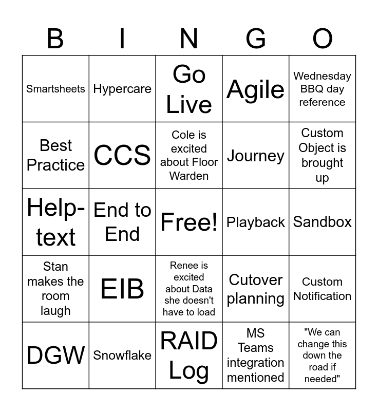 This bingo card has a free space and 29 words: DGW, Smoke Testing, End to End, Proxy, Smartsheets, Go Live, CCS, EIB, Playback, Snowflake, Sandbox, "We can change this down the road if needed", RAID Log, MS Teams integration mentioned, Custom Object is brought up, Someone cracks a diet coke, Renee is excited about Data she doesn't have to load, Stan makes the room laugh, Wednesday BBQ day reference, Help-text, Cutover planning, Change Impact mentioned, Journey, Best Practice, Agile, Hypercare, Custom Notification, Cole is excited about Floor Warden and Someone has a Stanley Cup.