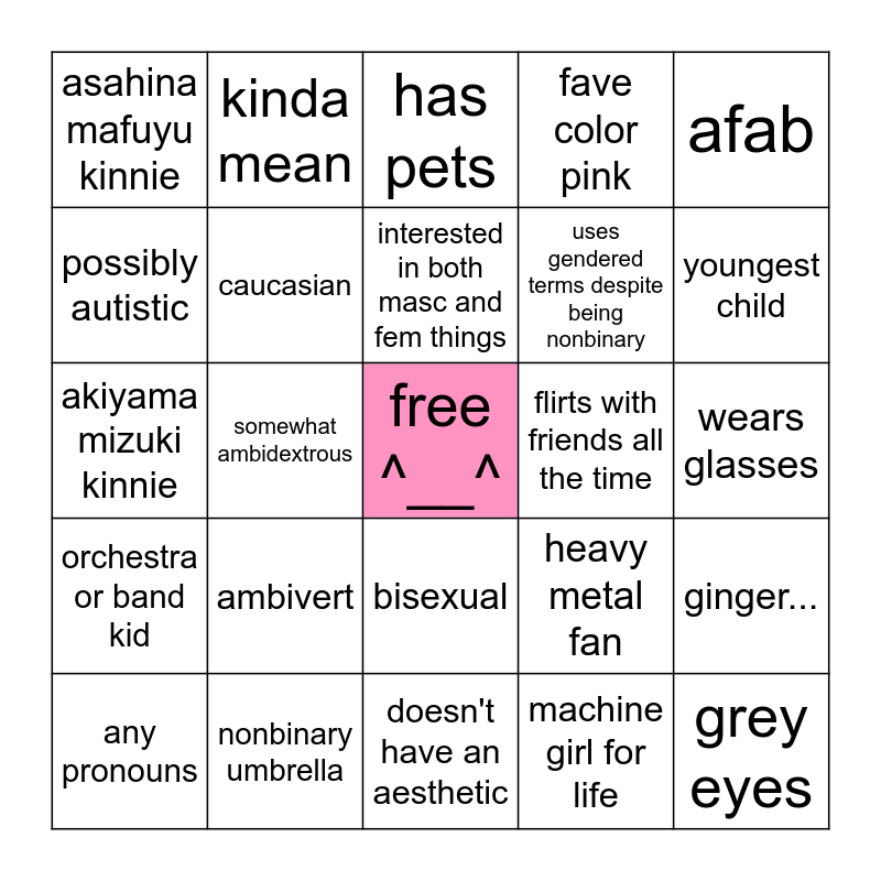 This bingo card has a free space and 24 words: ambivert, nonbinary umbrella, interested in both masc and fem things, any pronouns, afab, asahina mafuyu kinnie, possibly autistic, kinda mean, flirts with friends all the time, bisexual, uses gendered terms despite being nonbinary, akiyama mizuki kinnie, heavy metal fan, ginger..., caucasian, machine girl for life, wears glasses, has pets, youngest child, somewhat ambidextrous, grey eyes, orchestra or band kid, fave color pink and doesn't have an aesthetic.