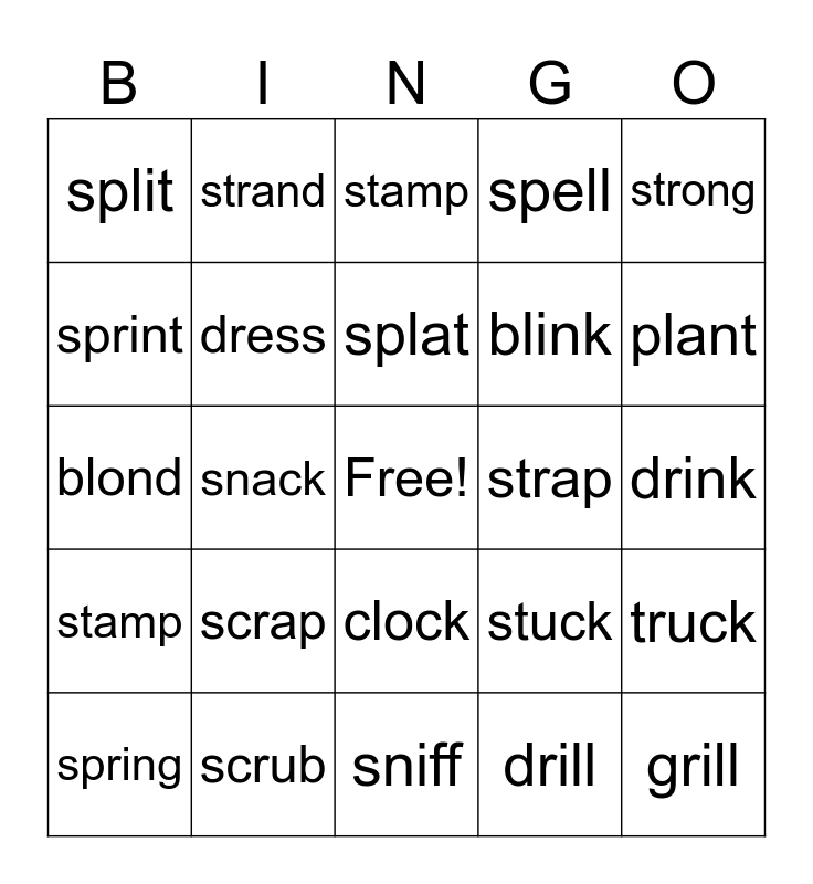 This bingo card has a free space and 24 words: scrap, scrub, splat, spring, strong, split, sprint, strand, strap, clock, blink, blond, stuck, truck, dress, drill, drink, stamp, plant, snack, grill, stamp, spell and sniff.