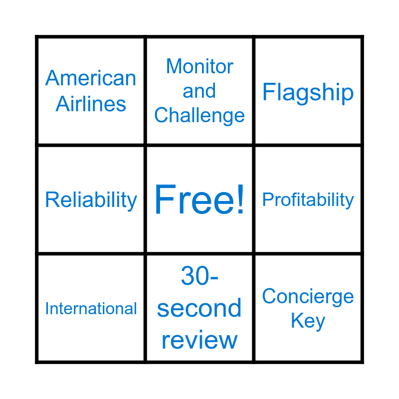 This bingo card has a free space and 29 words: Flight Attendant, Layover, Wings, Airbus, American Airlines, Flagship, International, Boeing, IFM, Comply365, DDB, D0, Hotel/Limo, Crew Scheduling, Uniform, Bidding, Reserve, MyFlight, Concierge Key, Executive Platinum, Widebody, Narrowbody, Accountability, Profitability, Reliability, Monitor and Challenge, Good slide!, 30-second review and Jump and slide! Jump and slide!.