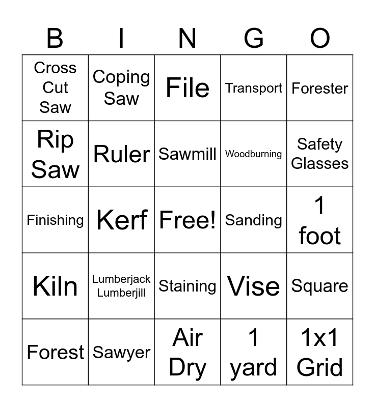This bingo card has a free space and 24 words: Lumberjack Lumberjill, Sawyer, Sawmill, Forest, Forester, Cross Cut Saw, Rip Saw, Coping Saw, Sanding, Staining, Woodburning, Finishing, Vise, Square, Ruler, 1 yard, 1 foot, File, Safety Glasses, Kerf, 1x1 Grid, Kiln, Transport and Air Dry.