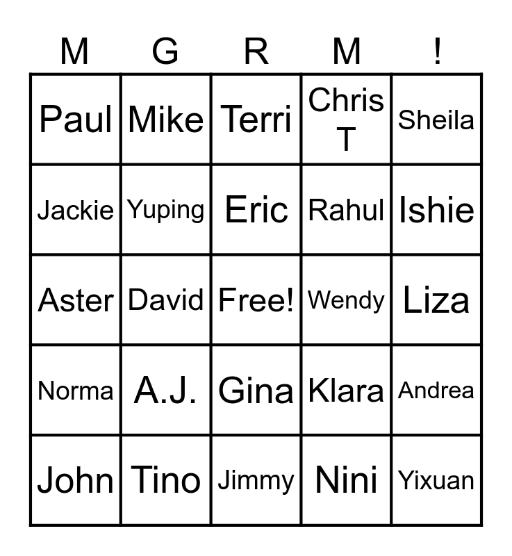 This bingo card has a free space and 41 words: Cynthia, Aster, Jonas, Yuping, Tino, Gina, Eric, Danny, Sheila, Norma, David, Chris T, Yixuan, Liza, Wendy, A.J., James, Paul, Youssouf, Terri, Andrea, Sarah, Jimmy, Rahul, Fred, Jeff S, Nini, CJP, Ishie, Manni, Kat, Mike, John, Weidong, Klara, Jackie, Jerry, Vic, Chuck, Marion and Kay.