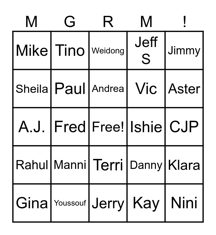 This bingo card has a free space and 41 words: Wendy, A.J., James, Paul, Youssouf, Terri, Andrea, Sarah, Jimmy, Rahul, Fred, Jeff S, Nini, CJP, Ishie, Manni, Kat, Mike, John, Weidong, Klara, Jackie, Jerry, Vic, Chuck, Marion, Kay, Cynthia, Aster, Jonas, Yuping, Tino, Gina, Eric, Danny, Sheila, Norma, David, Chris T, Yixuan and Liza.